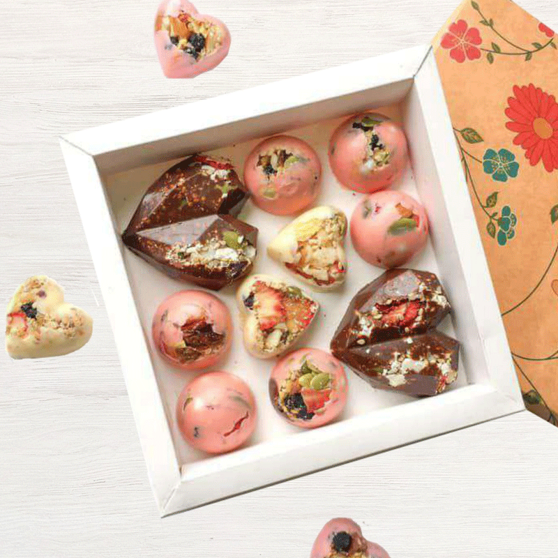 Contiene chocolate blanco con semillas, frutos deshidratados y frutos secos.